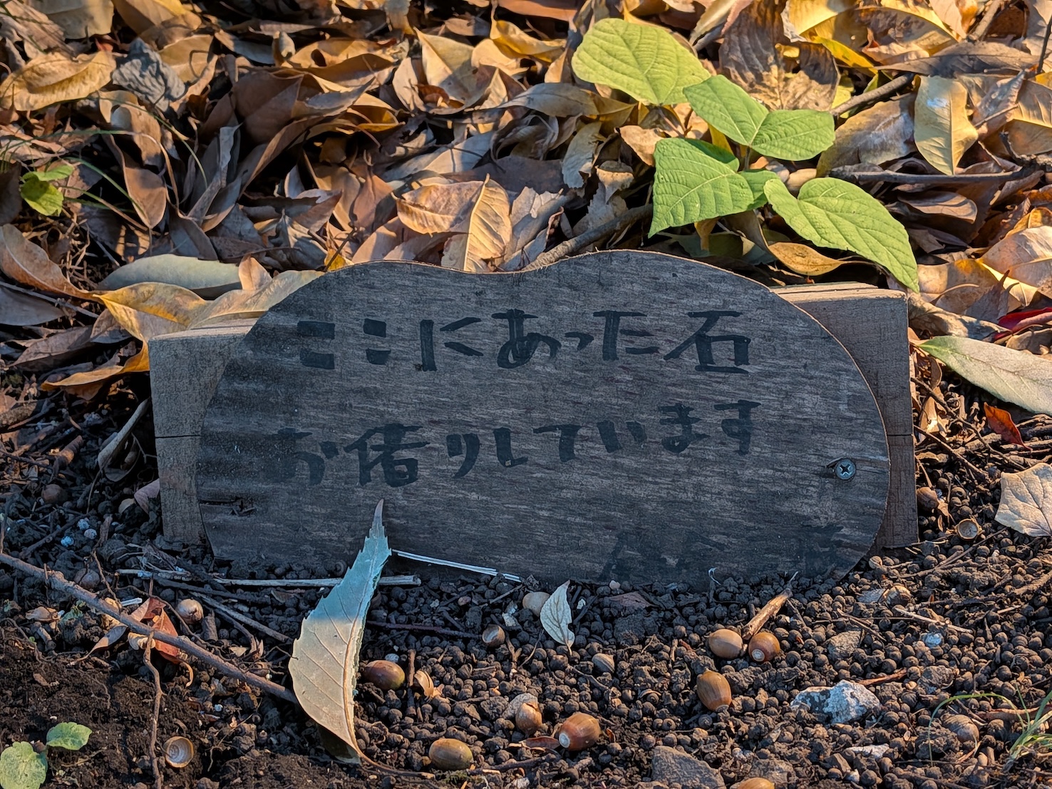 ある日の夕暮れどき、気づいた。キャンパスの小径にある、「石を借りた」なる置手紙(置看板?)に。端っこに黒い足跡がついているから、置かれてからだいぶ時間が経っているのだと思う。まあ、私物じゃないしいい……のかなあ?公共物の私的利用……、いや、石ってそもそも公共物……?ていうか何に使うの?なんでそんなん……