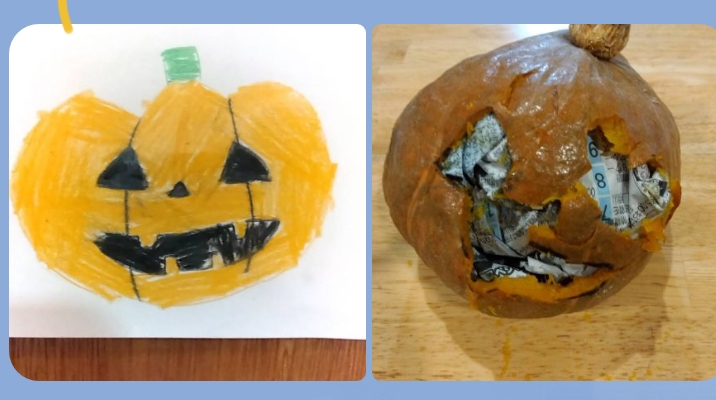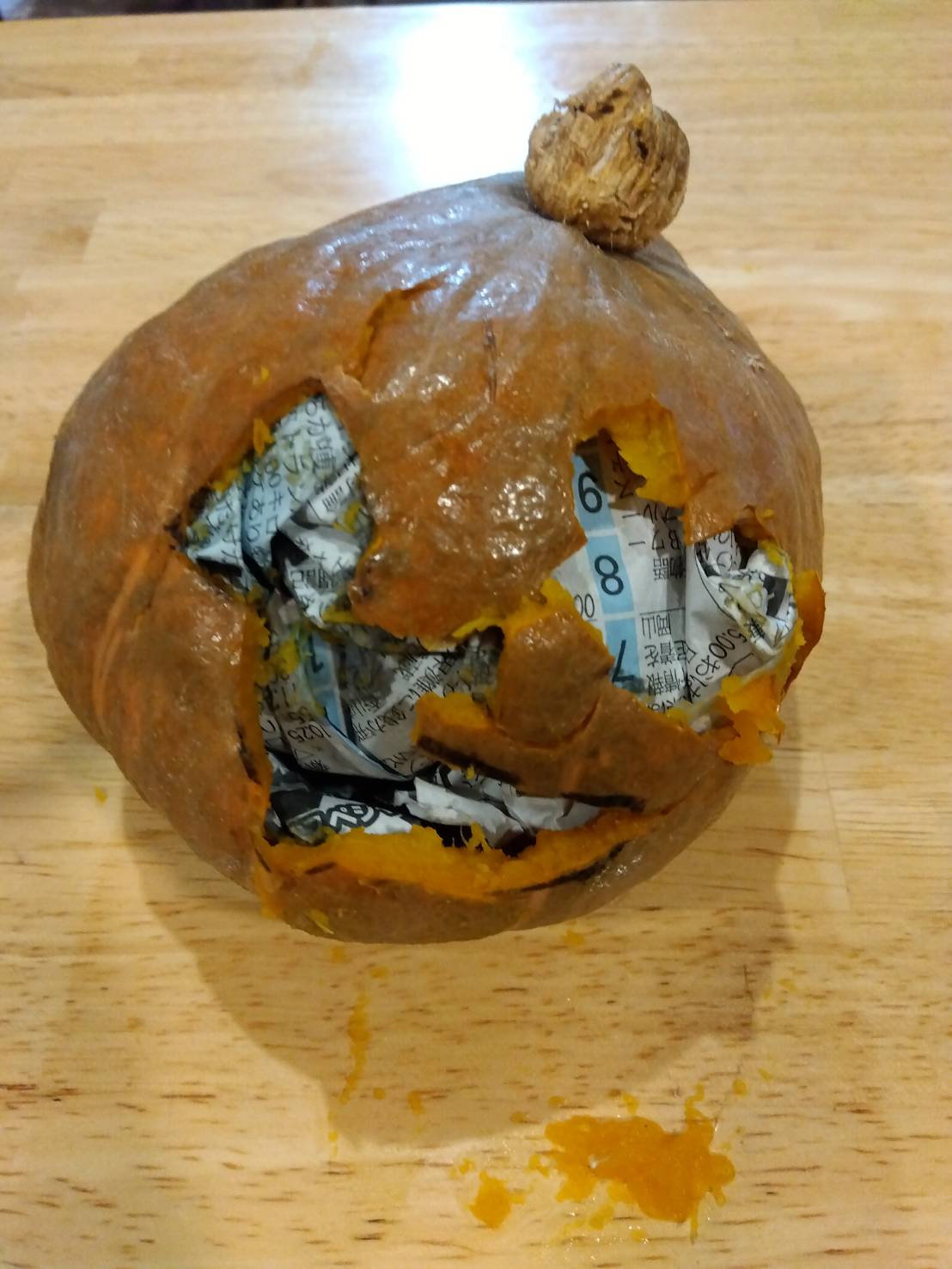 しかし、子供たちの理想のイメージとはかけはなれた姿に?。妻いわく、カボチャが硬いからレンジでチンしたらこうなったと?。