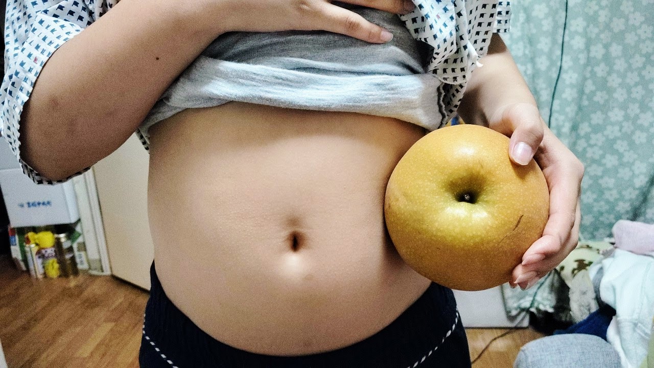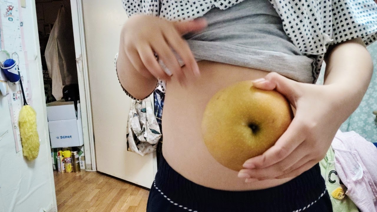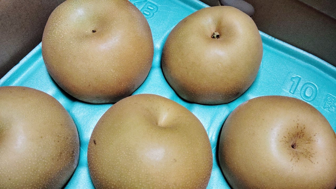 実家から大きな梨が送られてきました。何かに似ていると思いながらも、何に似ているか気づけずにいましたが、子が梨と自分のお腹を並べていた時、「ああ、これだ!」と合点がいきました。