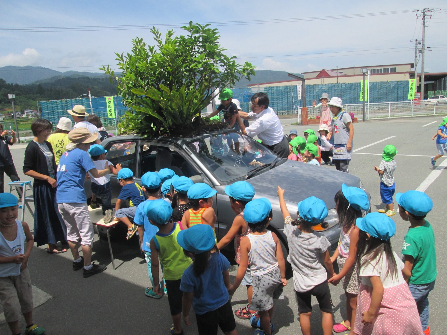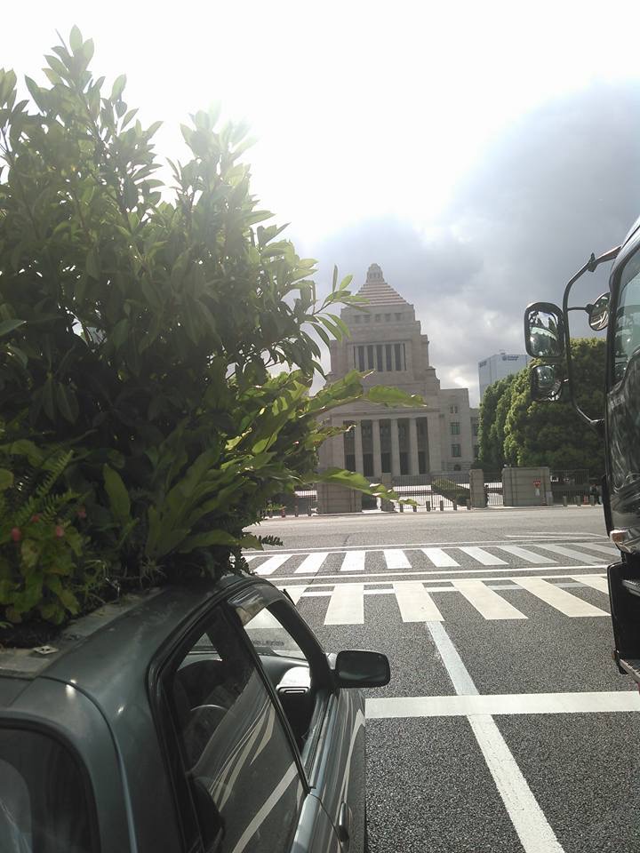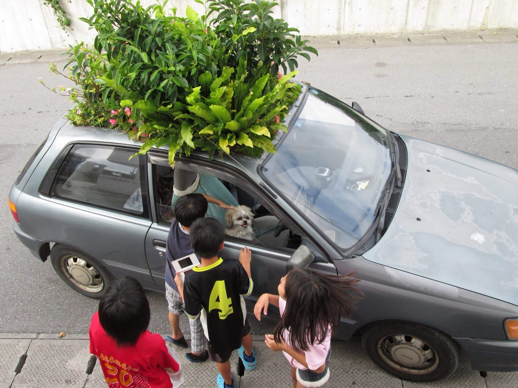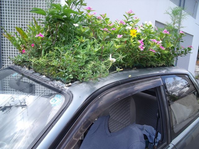 30年住んでいた東京、横浜から故郷沖縄に帰るときに車も持って帰りました。が、沖縄の夏は激暑です。車はエアコンが壊れていましたが、直すお金はありません。それで「常に木陰を走っている環境を屋根の上に作れば暑くないだろう」と、はじめは車上に芝生の種を撒きました。しかし私の予想もしない事が起こりました。「指さされて笑われる」のです。あまりに辛くて止めましたが、世界各地から再開のメールが届き覚悟を決め「次は車上を花畑にしよう」とチャレンジしましたが、ガジュマルの種が屋根に落ちて自然に芽が出てきて大きくなり、ホントに木陰が出来たのです。もちろん、指さされて笑われます。前から、後ろから、横から、上からも(マンションのベランダから)。親から「人に後ろ指刺されないような生き方をしなさい」と、言われてきたのに辛すぎました。