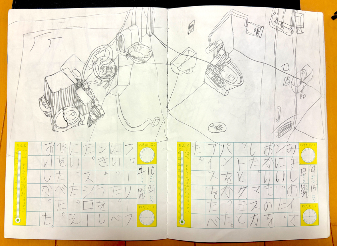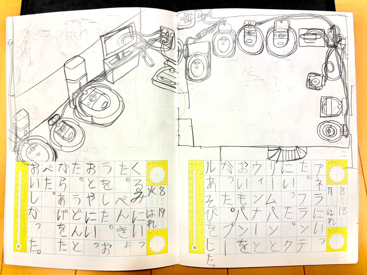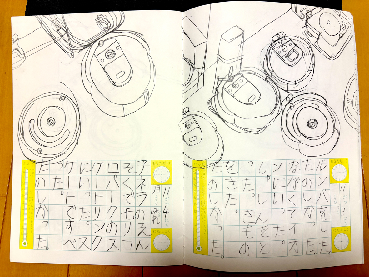 絵日記がトイレとルンバだらけなんですよ。 下の文章も可愛いんですけどね、全ページ、内容と関係なくトイレとルンバ。 今、7冊まで完成してるんですが、だいぶルンバになりましたね。 だいぶルンバになりましたね、って文章もおかしなもんですけど。