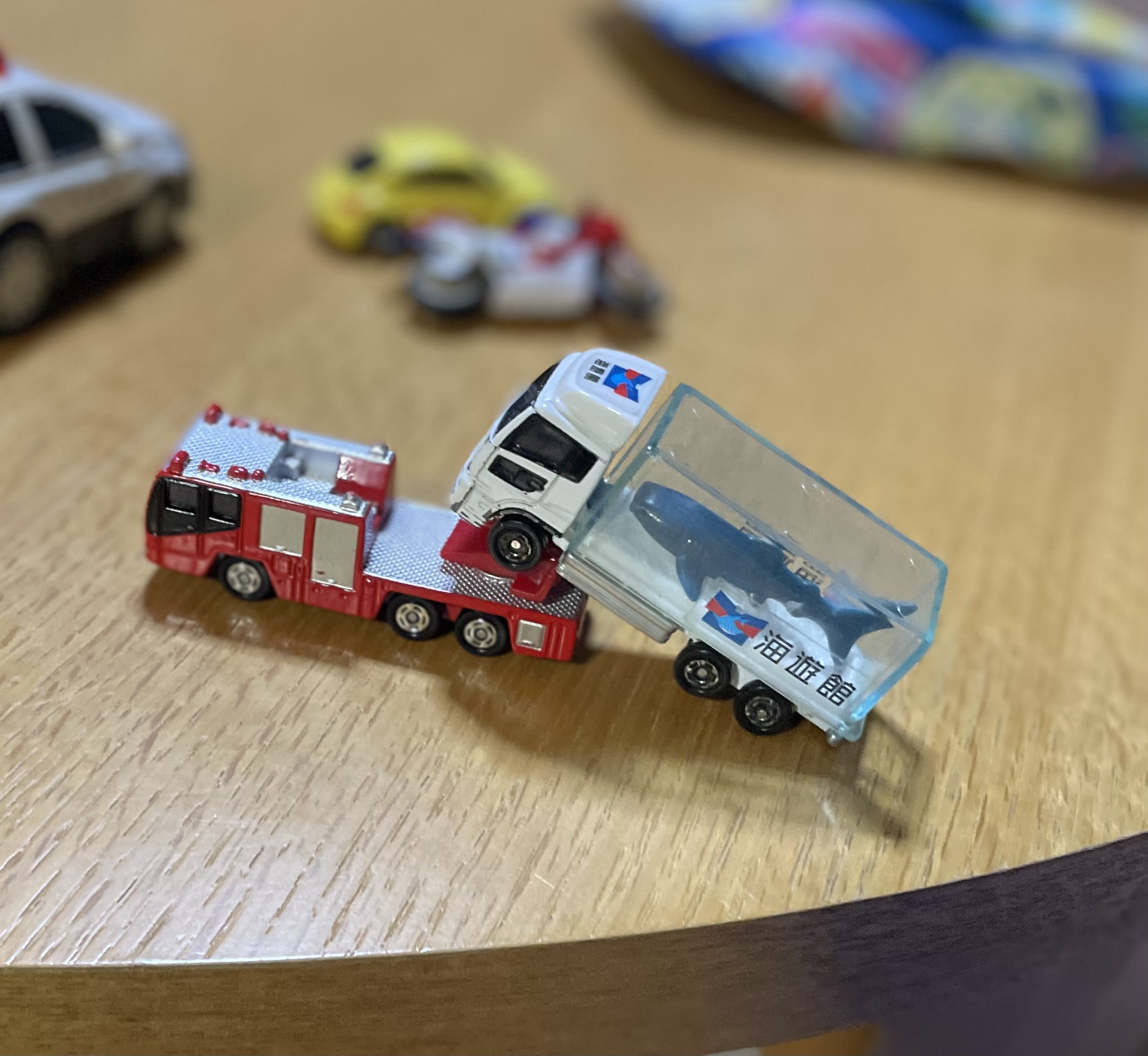 一言も発さず、ただただ虚無の眼差しで大好きなセレナちゃんを見つめていました。その日の夜、家族全員誰もキャンプのことは口にせず、過ごしました。3歳の彼もなんとなくその空気を読んで、大好きなトミカ遊びをしていました。その遊びを、暗い気持ちで呆然と見ていた時、思わず息が止まりました。