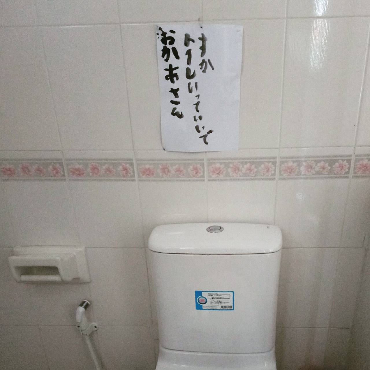息子が小さい頃、父親の仕事の関係で家族でタイで生活していました。その時のある昼下がりに絵の具で遊んでいました。「お母さん見て!」とじゃーんと掲げた紙に「おかぁさん、トイレいっていいですか?」と書いてありました。「そんなん書いてないで早くトイレに行きなさいよー」って言ったんですが、そんな事をわざわざ書いてアピールしてくる息子にお茶目さを感じて、ずっとおトイレにその紙を貼り付けていました。トイレに行きたいのに、わざわざ書いて伝えるその行為に愛おしさを感じずにはいれませんでした。それをトイレにいるのに、トイレしているのに目の前に「トイレいっていいですか?」貼っておくのも、また洒落がきいていいなと、それから毎日癒されていました。普段何気ない行動もこうやって文字にしてしまうとたちまちアートになりますね