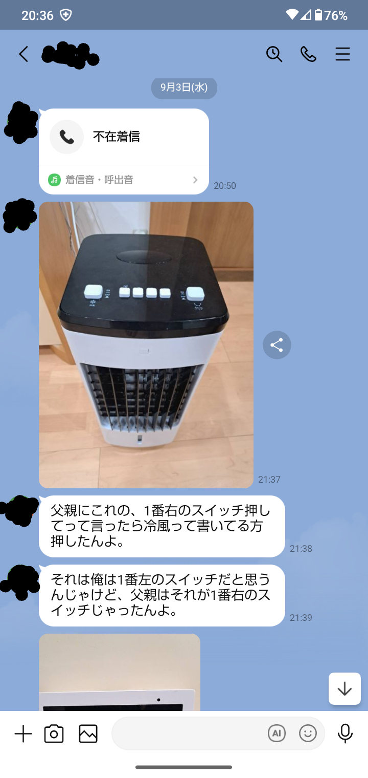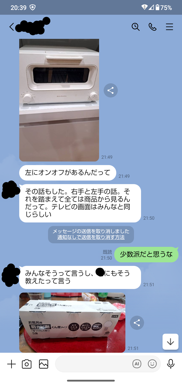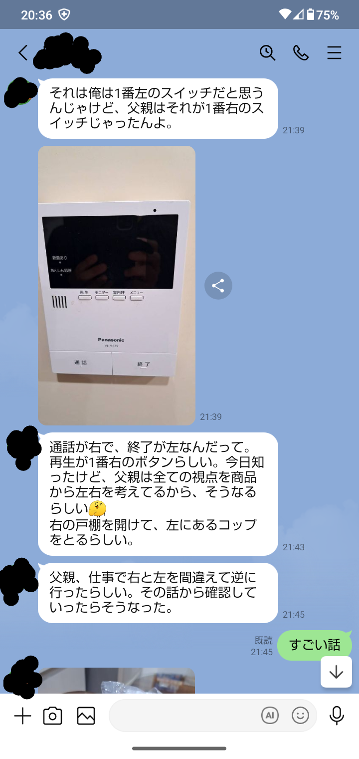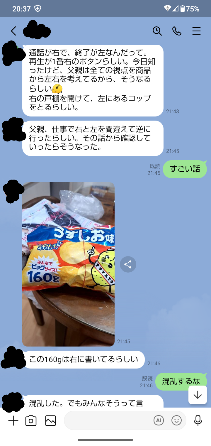 弟からめずらしく連絡があった。70歳の父親の、右と左の感覚がおかしいという。仕事でどこかの現場に行く途中、左右を間違えてたどり着けなかったという雑談がきっかけで発覚した。ある程度大きさがあって対面にあるものの左右が反転するらしい。弟と母はこの現象の境目を見つけようと質問を重ねて、冷風機とインターホンとオーブントースターと防カビ剤は左右が反転して、食品用ラップは反転しないことがわかった。(しかしポテトチップスの袋は反転する。)弟は「いままで誰も気づかなかったのが不思議だ」と言っていた。