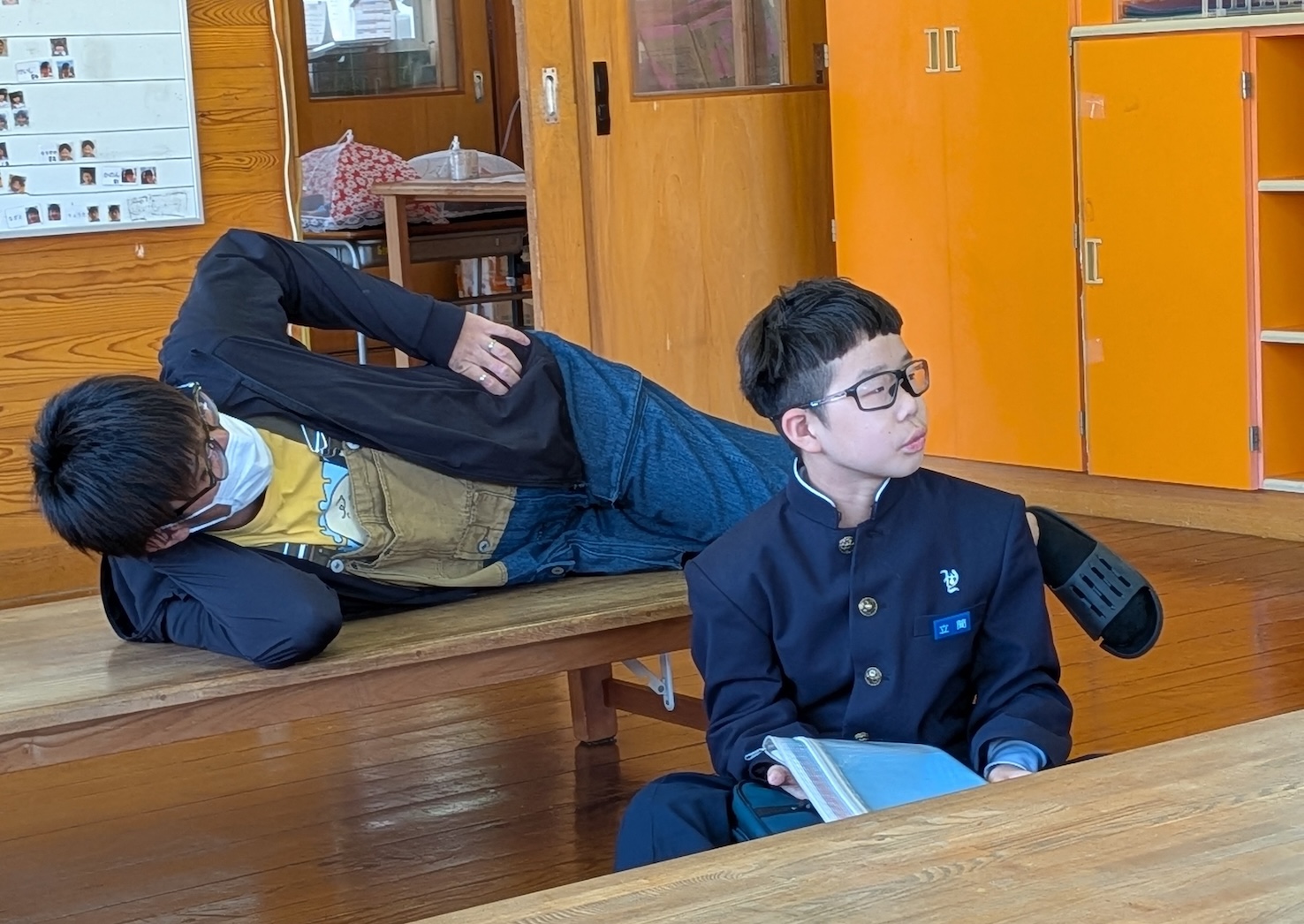 いつも大人のボケに突っ込いんでくれるs君 今日も変わらずキレキレのツッコミを入れまくる。 しかし、背後に大きな影が!! s先生が横になっているではないか!! 本人は、いつ気づくのか!? なんでそんなん気付かんのん?笑と、にっこりする一幕でした?