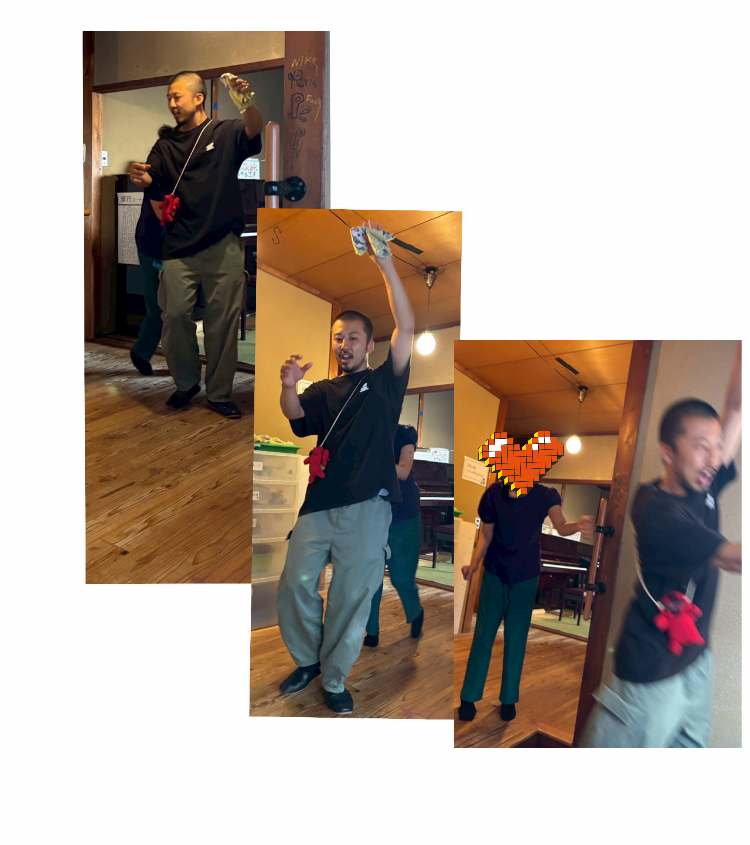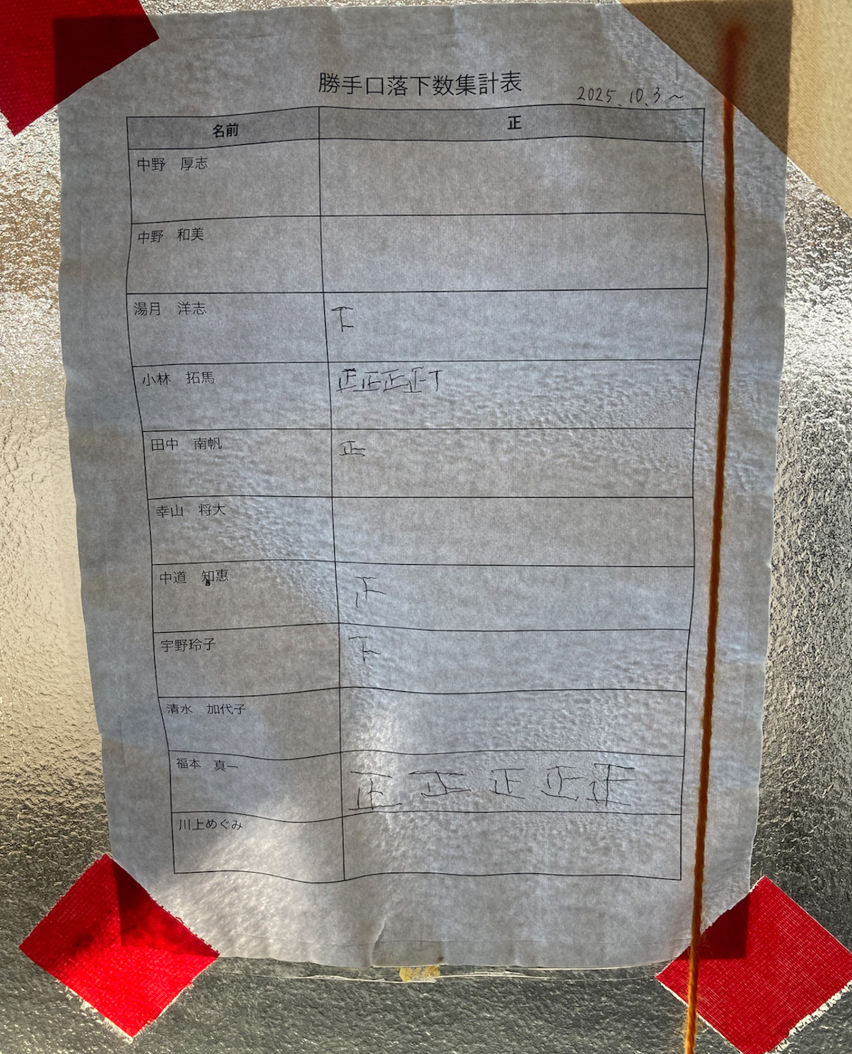 ”はーちゃん”は玄関や勝手口からスタッフを突き落として遊んでいる。その瞬間は突然訪れて、導かれるスタッフはお決まりとわかりつつも、”押すなは押せでもある”という先人たちのありがたい伝統芸の教えに習い、これまで幾度となく突き落とされてきた。スタッフの反応をあっさりと見送り、無邪気に笑いながら去っていく後ろ姿を何度も見てきた私はこれは芸ではなくゲームであると捉えた。 落とされる回数を数えるための、”勝手口落下数集計表”を作成することにして、これまでノーカウントで落とされていた状況に集計するという謎行為を挟むことで落とされることがまるでポイントのように感じてなんだか嬉しい。