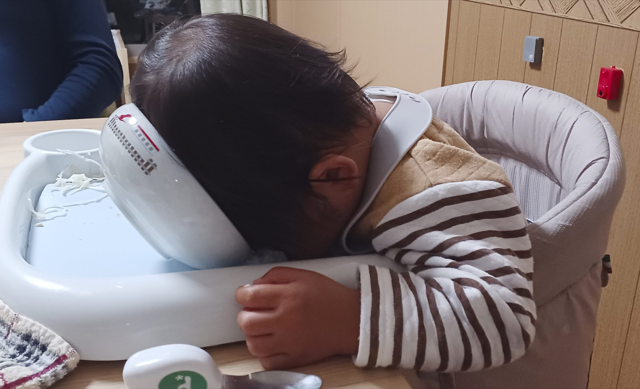 夕飯の時間。 はじめはスプーンを持って、ごはんもパクパク食べていた。 でも途中からまぶたが重くなり、スプーンも止まり始め、頭がゆーらゆーら…。 「ガクン!」と頭が前に倒れて、お皿にスボッ。 まるで「お皿に吸い込まれたのでは?」と思うほどの勢いで、夢の世界へ一直線。