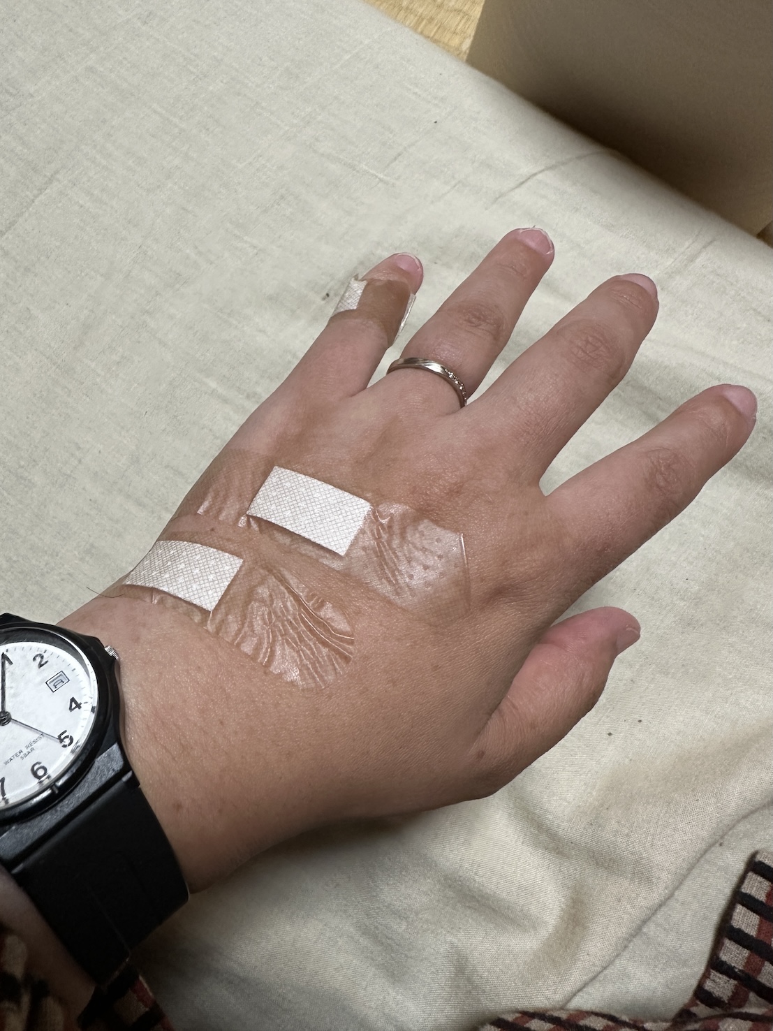 怪我もしていないのに絆創膏を貼りまくるのっくん。 絆創膏を八ツ橋のように重ねたり、絆創膏の上からオロナイン軟膏を塗ってさらに絆創膏を重ねる。 はじめは母に貼ってもらっていたのを、今では器用に自分でペタペタできるようになった3歳。 とうとう母の手にも貼りはじめました。